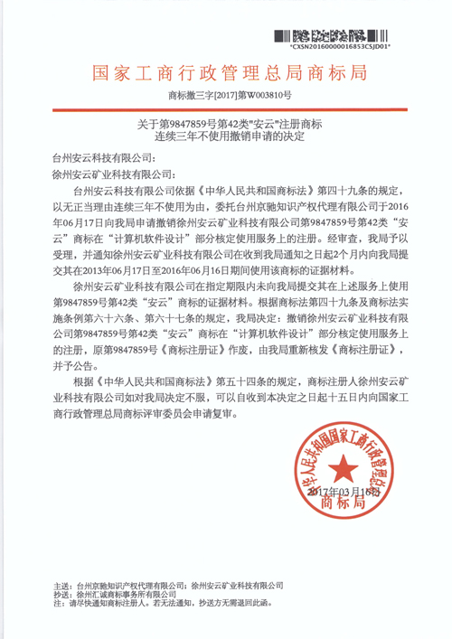 “安云”注冊商標撤三決定